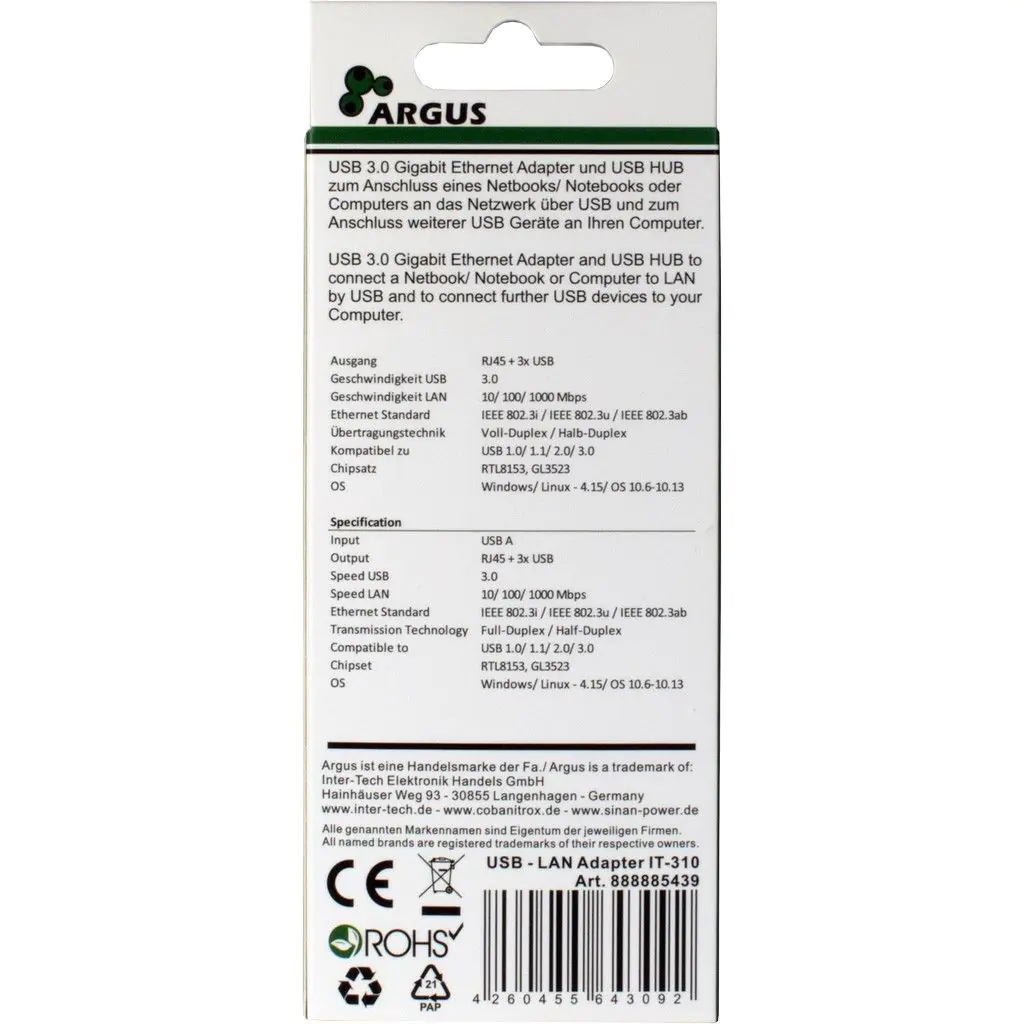 | Inter-Tech Argus IT-310 - Hub - 3 x SuperSpeed USB 3.0 + 1 x 10/100/1000 | ||||