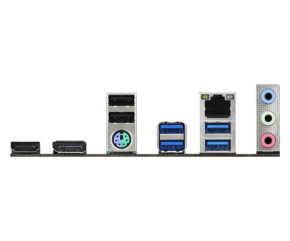 | Schnittstellen: | 1x LAN (Gigabit Ethernet); 1x HDMI; 4x USB 3.2 Gen 1; 1x Mikrofon - Mini-Klinkenstecker; 1x Audio Line-In - Mini-Klinkenstecker; 1x Audio Line-Out - Mini-Klinkenstecker; 1x PS/2-Tastatur/Maus; 1x DisplayPort; 2x USB 2.0 | |