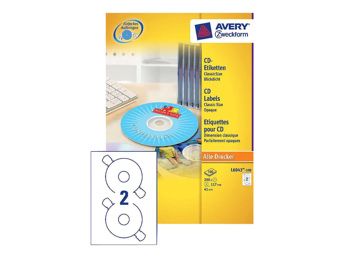 Erstellen Sie professionell gestaltete CDs mit den CD-Etiketten von Avery Zweckform. Die CD-Aufkleber sind mit praktischen Haltelaschen ausgestattet, die ein einfaches und mittiges Aufbringen ermöglichen. Dank der kostenlosen Avery Zweckform Vorlagen und Software-Lösungen können Sie die Etiketten schnell und einfach gestalten und drucken!