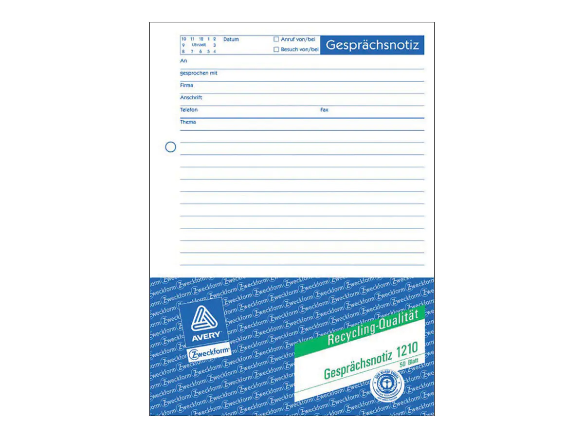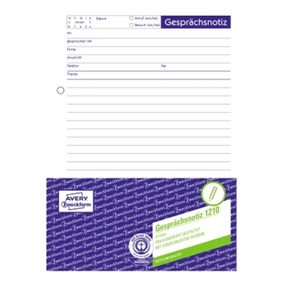 Nie mehr etwas vergessen - mit der Gesprächsnotiz von Avery Zweckform. Das Formular kann vielfach eingesetzt werden - ob zur Gesprächsvorbereitung, als Bestätigung, Gedankenstütze oder als Protokoll. Die Gesprächsnotiz ist aus Recyclingpapier hergestellt.