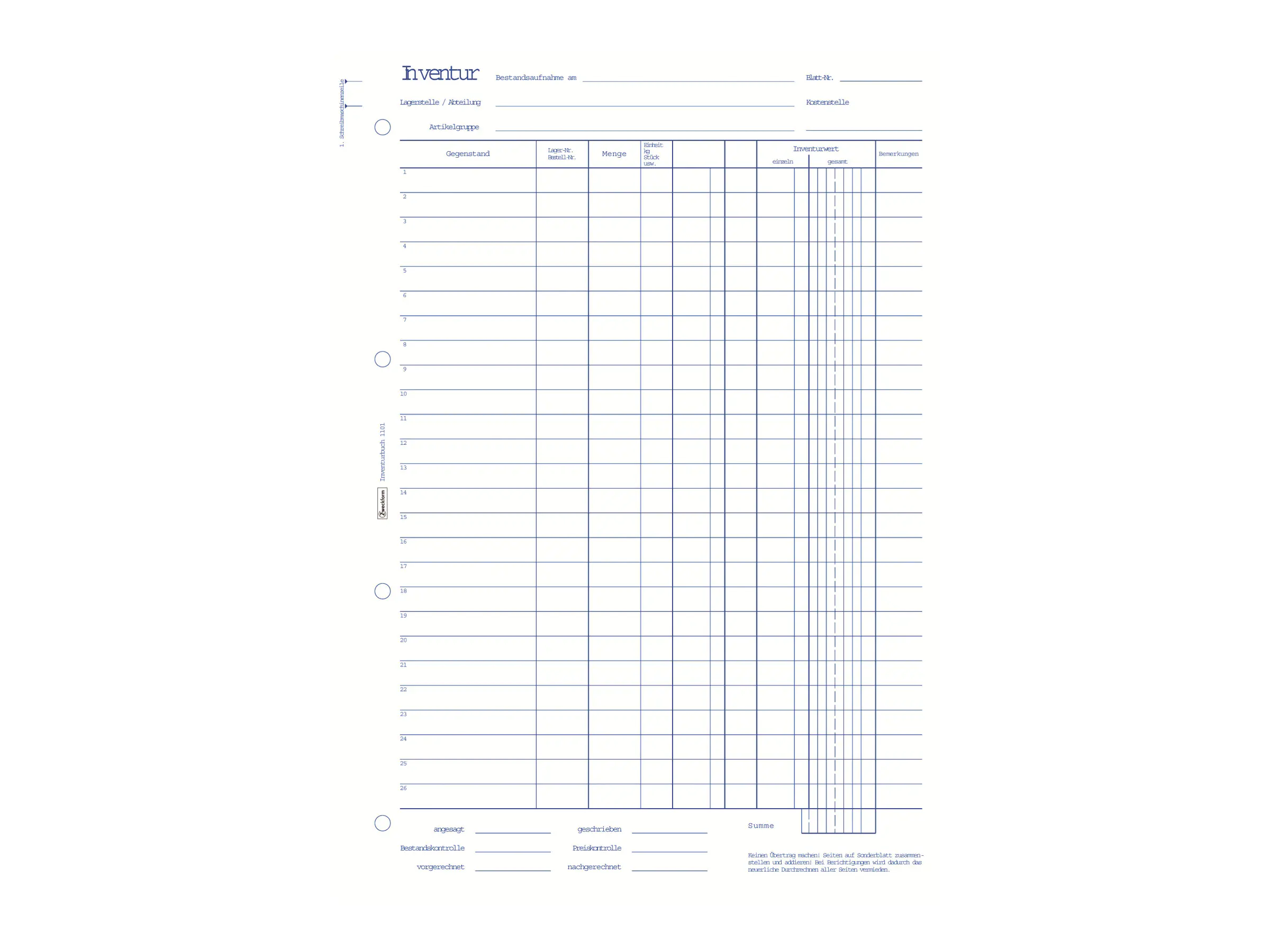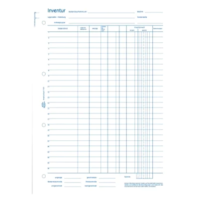 Das Inventurbuch von Avery Zweckform eignet sich ideal für die regelmäßige Bestandsaufnahme. Das Inventurbuch ist 4-fach gelocht und ist mit hand- und schreibmaschinengerechtem Zeilenabstand versehen.