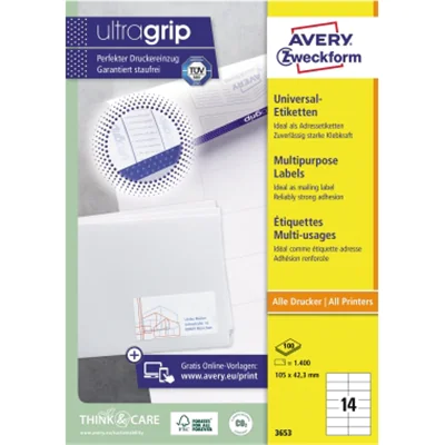 Ideal als Adressetiketten oder zum Auszeichnen von Waren. Überzeugen mit einem klaren Druckbild ohne Verwischen. Dank der innovativen ultragrip-Technologie können Sie sich auf einen ultrapräzisen Druckereinzug und absolut staufreien Druckerdurchlauf verlassen. Gestalten und drucken Sie Ihre Aufkleber schnell und einfach - mit den kostenlosen Avery Zweckform Etiketten Vorlagen und Software-Lösungen unter www.avery.eu/print.