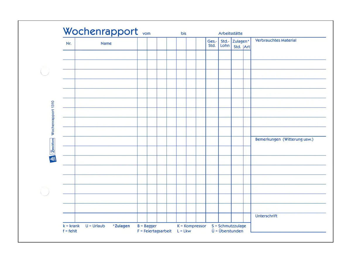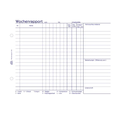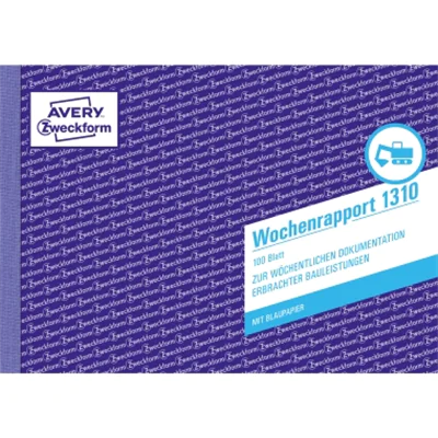 Die Bauformulare von Avery Zweckform sind unverzichtbare Helfer für Bau und Handwerk. Der Wochenrapport eignet sich besonders, um die wöchentliche Arbeitsleistung und den Materialverbrauch zu dokumentieren. Der Wochenrapport im DIN A5 Querformat beinhaltet 2 Blatt Blaupapier. Die Bauformulare von Avery Zweckform sind vorgelocht, für eine schnelle Ablage!