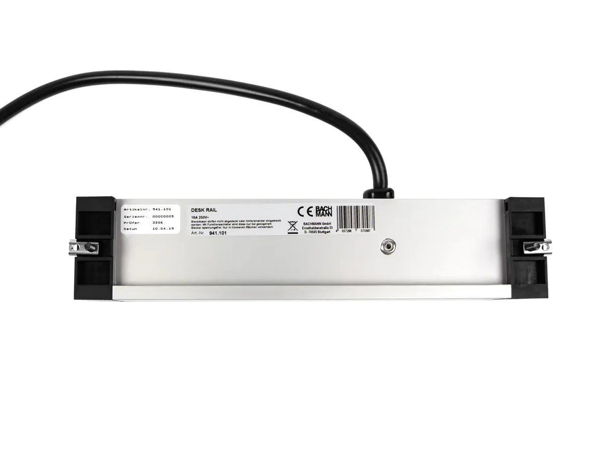 Die Bachmann DESK RAIL 941.001 ist mit 2 Steckdosen, 1 USB Doppelcharger und 1 Custom Modul zur individuellen Bestückung ausgestattet. Die Befestigung gelingt einfach durch das Anschrauben an der Frontseite, während Daten- und Stromzuleitungen von unten erfolgt. Die Bachmann DESK RAIL ist, dank der Universalaufnahme, nahezu mit allen Standard-Relingsysteme kompatibel.