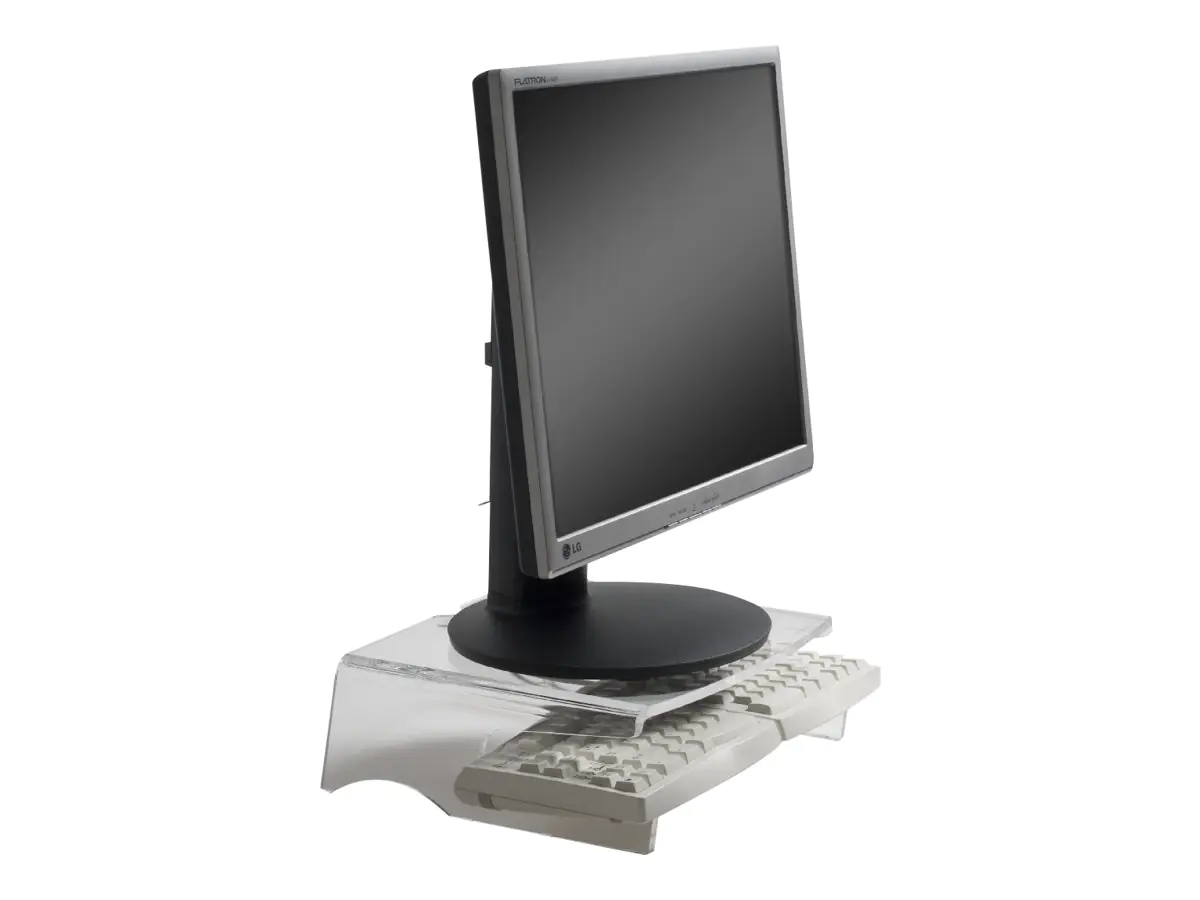 Der Monitorständer Q-Riser 100 bringt zu niedrig aufgestellte Monitoren in eine komfortable Arbeitshöhe. Im Ständer ist ein Stellplatz für eine vollständige Tastatur integriert.