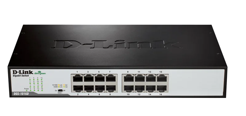Der unmanaged Desktop-Switch DGS-1016D bietet 16 Plug-and-play-Anschlüsse für kleine Büros, Arbeitsgruppen- und Abteilungsnetzwerke mit 10/100 Mbit oder 10/100/1000 Mbit. Das typische Einsatzgebiet für diesen unmanaged Switch sind Segmente mit begrenzten Anforderungen, bei denen weder Konfiguration noch Netzwerkmanagement benötigt werden.
