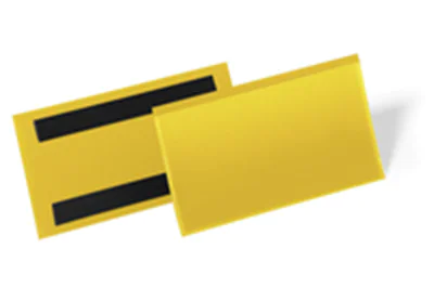 Etikettentasche mit zwei rückseitigen Magnetstreifen. Anwendung an metallischen Oberflächen wie z.B. an Lagerregalen und Metallbehältern.