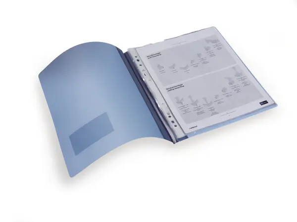 Mit kunststoffummantelter Heftmechanik mit Endkappen. Transparente Innentasche für ungelochtes Schriftgut. Vorderdeckel mit Beschriftungsfenster im Visitenkartenformat (57 x 90 mm).