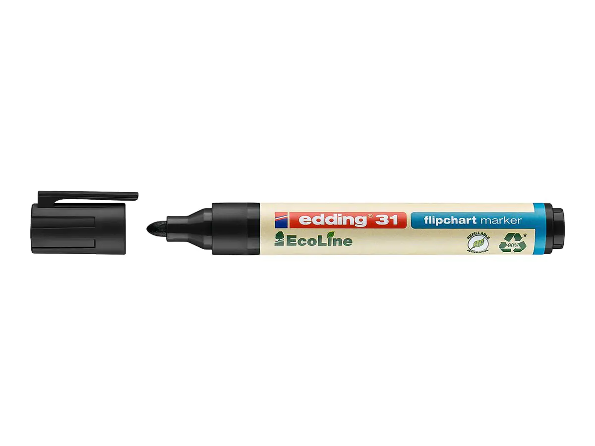Kunststoffteile bestehen insgesamt mindestens zu 90% aus recyceltem Material (83% post-consumer). Speziell zum Schreiben auf Flipchartpapier. Geruchslose Tinte schlägt nicht auf die nachfolgenden Seiten durch.