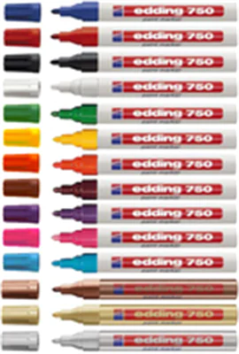 Der edding 750 paint marker hat eine 2 - 4mm breit malende Rundspitze. Vor der Verwendung sollten Sie den Marker bei aufgesetzter Kappe kurz schütteln, danach den Marker öffnen und die Spitze auf einem Testpapier vorsichtig auf- und abpumpen, bis Farbe die Spitze füllt. Schon ist der edding 750 paint marker startklar. Die Tinte ist äußerst geruchsarm und nach dem Trocknen wasser-, abrieb-, licht- und hitzebeständig.