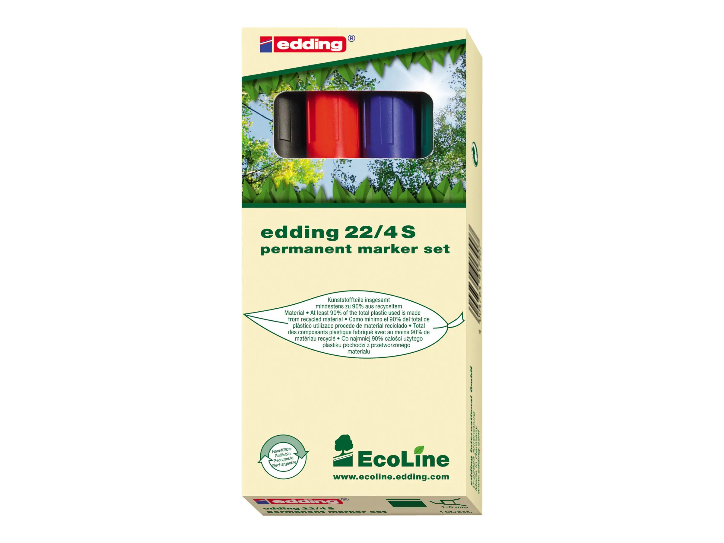 Das Produkt ist Teil der neuen edding EcoLine-Reihe. Kunststoffteile bestehen insgesamt zu mindestens 90 % aus recyceltem Material (83% post-consumer). Zum Beschriften, Markieren und Kennzeichnen von fast allen Oberflächen, wie z.B. Papier, Kunststoff, Metall und Glas.