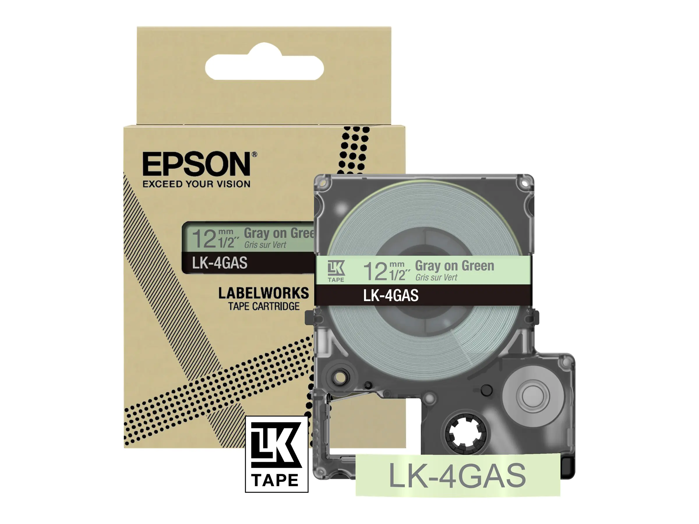 Epson LabelWorks LK-4GAS - Grau auf Grün - Rolle (1,2 cm x 8 m) 1 Kassette(n) Hängebox - Bandkassette - für LabelWorks LW-C410, LW-C610