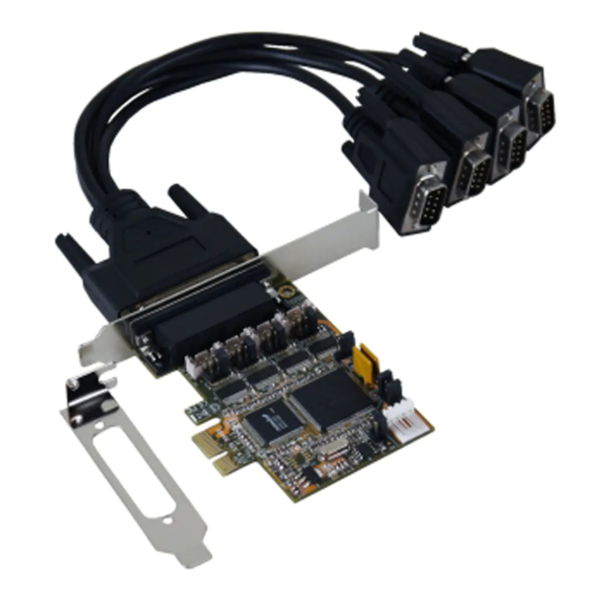 Die EX-44384 PCI-Express I/O-Karte stellt vier serielle RS-232 High Performance UART 16C1050 Ausgänge zur Verfügung. Sie ist entwickelt worden, um vier weitere serielle Ports für PC, kleine Workstation oder Server über den PCI Express Bus zu erweitern. Die Karte ist voll PCI-Express Plug-and-Play kompatibel und hat keine Probleme mit IRQ und I/O Adressen Konflikten. Zusätzlich ist +5V oder +12V auf Pin 9 des seriellen Steckers konfigurierbar für ein POS System (Power over System).