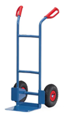 Handlich, mit Stahlblechschaufel, stabile Schweißkonstruktion, pulverbeschichtet, blau, RAL 5007. Sicherheitsgriffe. Stahlblechschaufel anschraubbar und dadurch austauschbar. Räder mit Luftbereifung, auf Kunststoff-Felgen. Naben mit Rollenlagerung. Bügel oben und Querstreben durchgebogen. Für den sicheren Transport von runden Gütern, wie Rollen, Kannen, Eimern usw.