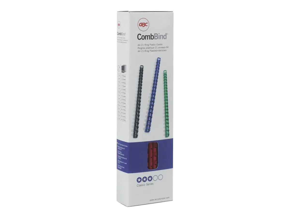 Mit den CombBind Plastikbinderücken können Sie stilvoll gebundene Dokumente erstellen. Die gebundenen Seiten sind flach liegend und ermöglichen so bequemes Erstellen von Notizen oder das Kopieren einzelner Seiten. Sie sind aus hochwertigem, strapazierfähigem Material hergestellt und sind kratzfest. A4, 8 mm, 100 Stück.