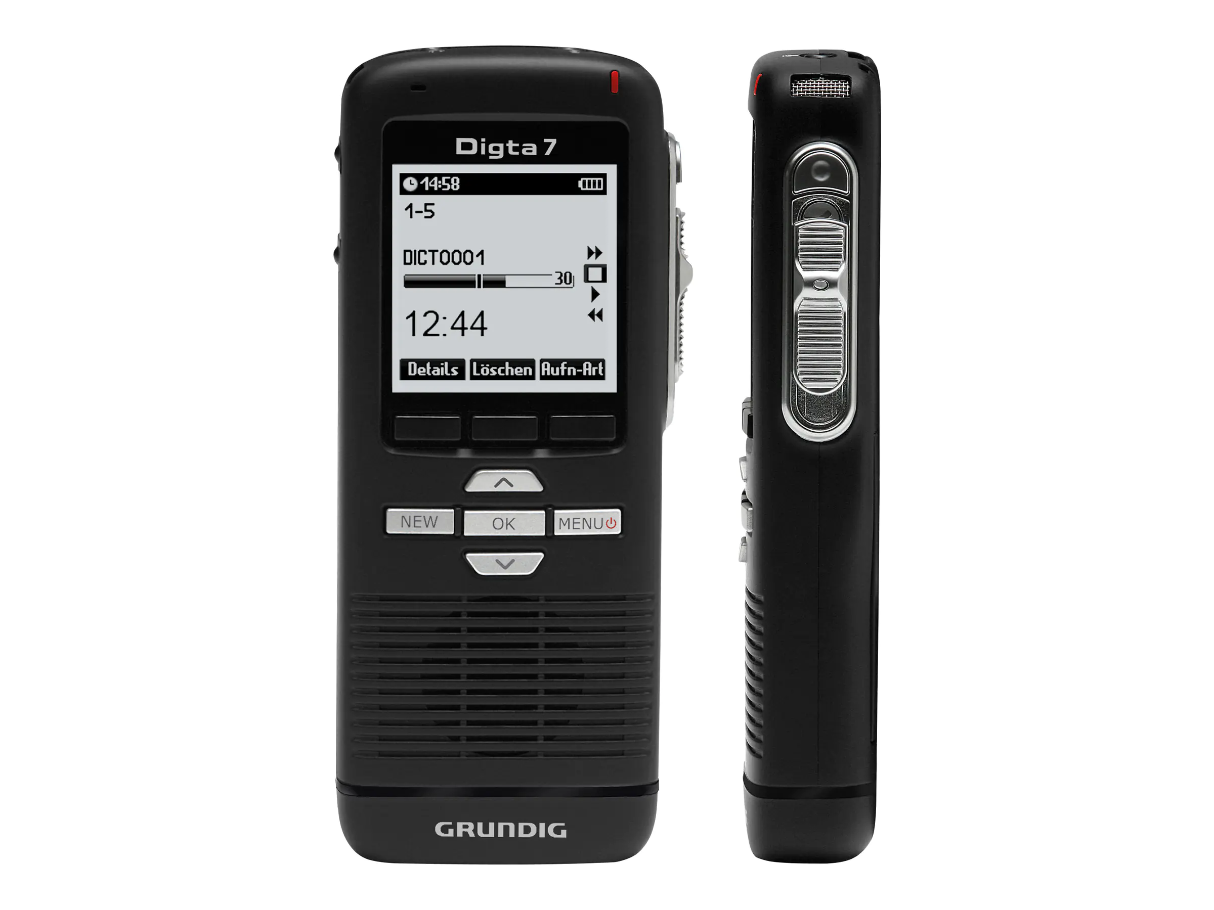 Das Digta 7 verfügt über einen neuartigen Schiebeschalter mit "Touch Pin". Er erlaubt, die Schiebeschalterstellung beim Diktieren zu erfühlen, denn der "Touch Pin" tritt in der "Stopp"-Stellung aus dem Schiebeschalter hervor. Außerdem ermöglicht dieser Schiebeschalter vier verschiedene Bedienvarianten. Durch einfaches Umstellen können Sie selbst Ihre bevorzugte Schiebeschalter-Variante für das Digta 7 wählen. Das ist besonders praktisch für Umsteiger oder auch Diktier-Einsteiger. Übrigens: Sie können das Digta 7 auch als PC-Mikrofon verwenden. Schließen es einfach mit einem USB-Kabel an Ihren Rechner an! Das transflektive, hintergrundbeleuchtete Display des Digta 7 stellt mit 160 x 160 Pixel und 16 Graustufen die Texte und Grafiken scharf, aber unaufdringlich dar. Helles Umgebungslicht, auch direkte Sonneneinstrahlung, verstärkt den Kontrast. Grau hinterlegte Felder gruppieren die angezeigten Informationen auf dem Digta 7 sinnvoll und übersichtlich. Aktive Einstellungen sind deutlich hervorgehoben. Im Display des Digta 7 zeigt Ihnen ein selbstskalierender Fortschrittsbalken die Länge des Diktats an. Auch mit Hilfe der Aufnahme-LED haben Sie immer einen guten Überblick - unabhängig davon, wie lang Ihr Diktat mit dem Digta 7 wird. Das Digta 7 verfügt über einen "Easy Mode". Hierbei sind die Funktionen im Display auf das Wesentliche reduziert. Vor allem Diktanten, die vom analogen Diktieren aufs digitale Diktieren umsteigen, schätzen diese Funktion. Sie müssen sich nicht groß umstellen und profitieren von der einfachen Bedienung des Digta 7. Unterschiedliche Einstellungen und Diktatnamen von bis zu 20 Benutzern mit verschiedenen Namen und Passwörter auf einem Gerät! Dieses Diktiergerät wurde für den mobilen Einsatz optimiert. Das Gehäuse des Digta 7 zeichnet sich durch ein hochwertiges, ergonomisches Design aus. Es ist darüber hinaus extrem robust und schockabsorbierend. Inkl. Konfigurationssoftware Digta Configurator und DssMover (als kostenloser Download). Netz- und Akkubetrieb möglich, Netzgerät und Akku nicht im Lieferumfang. Inkl. PC-Software DigtaSoft One inkl. Lizenz für einen User (nur Windows®).