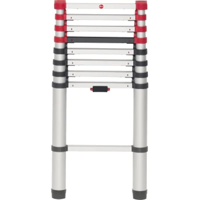 Sicherheits-Teleskopleiter die Leiter Höhe individuell einstellbar durch das Ausfahren einzelner Sprossen. Einzigartiges Einhand-Entriegelungssystem ermöglicht einfaches und sicheres Einfahren der Leiter. Keine Klemmgefahr durch Sicherheitsabstand zwischen den Sprossen. Leichte Erkennbarkeit des Verriegelungsstatus durch farbige Verriegelungsanzeige an jeder Sprosse. Gummierter Wandstoßschutz. Große Kunststoff-Füße und Quertraverse. Transportgurt.