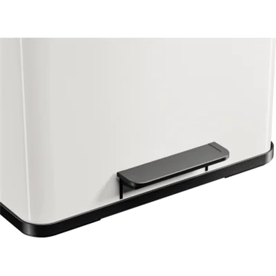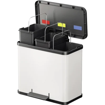 Der Tret-Mülltrenner mit drei einzeln entnehmbaren Inneneimern. Gedämpfter Deckel-Schließ-Mechanismus (Soft close). Ergonomisch breites Fußpedal aus Kunststoff. Innenliegende Tretmechanik. Inkl. Farbsticker zur Müllsorten-Kennzeichnung.