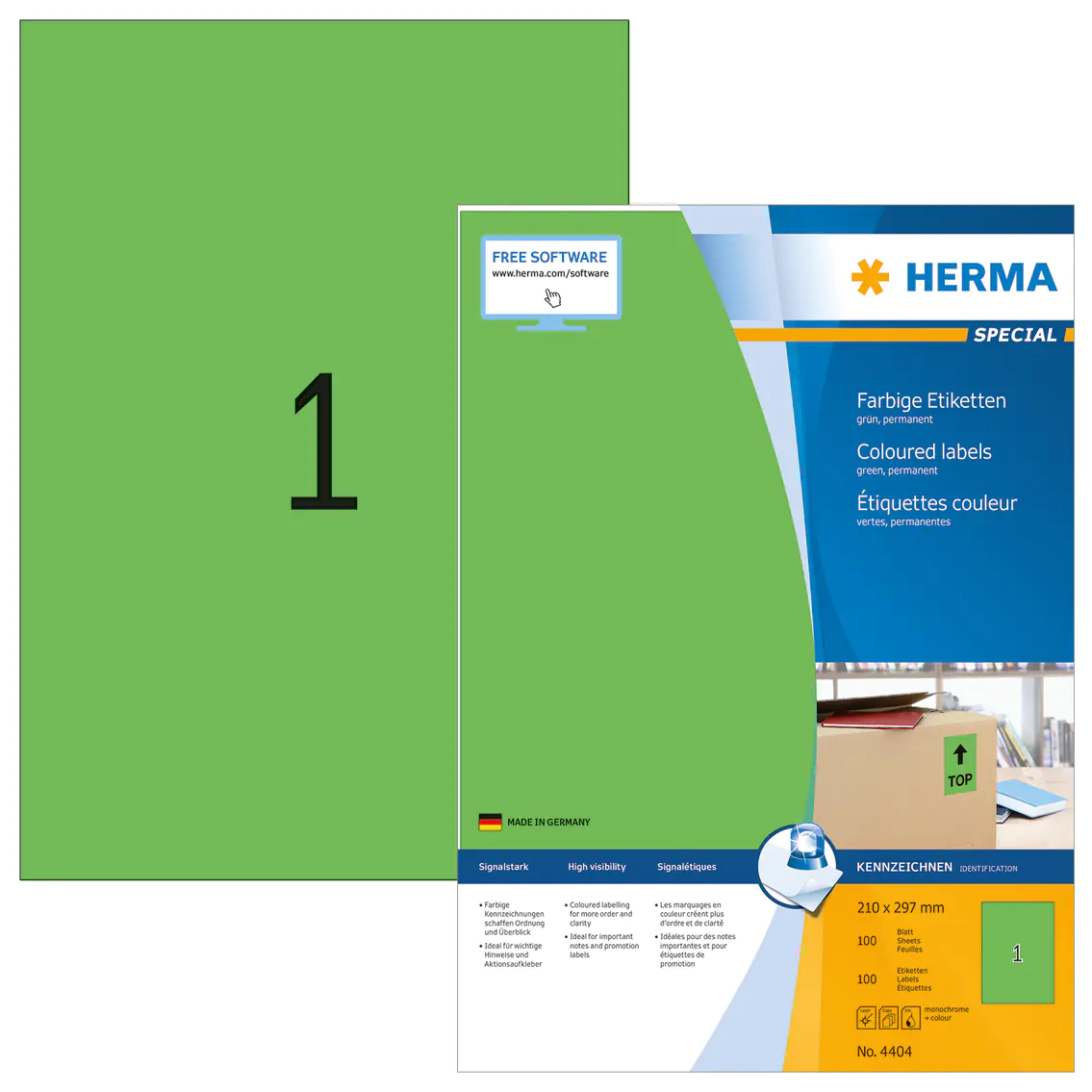| Beschreibung | HERMA Special - Papier - matt - permanent selbstklebend - grün - A4 (210 x 297 mm) 100 Etikett(en) (100 Bogen x 1) Etiketten | |||