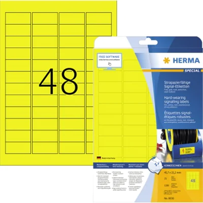Ideal für stark beanspruchte Etikettierungen und im Außenbereich: Eigentumsetiketten, Hinweis- und Warnschilder, Kennzeichnungen in Lager und Produktion. Besonders auffallend durch Signalfarbe. Strapazierfähige wetterfeste Oberfläche Schmutz abweisend. Störungsfreie Verarbeitung durch Rundum-Sicherheitskante und optimale Planlage. Nicht für Inkjetdrucker geeignet. Kostenlose Softwarelösungen: www.herma.de/software.