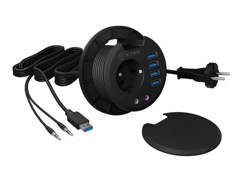 Der IB-HUB1430 ist die elegante Lösung für einen aufgeräumten Schreibtisch. Er lässt sich werkzeuglos in vorhandene Tischbohrungen (80 mm) einfügen und bietet genügend Platz, um mehrere Kabel durchzuführen.