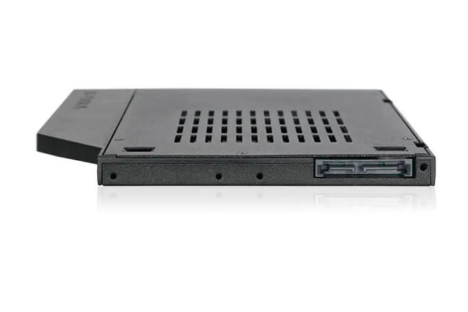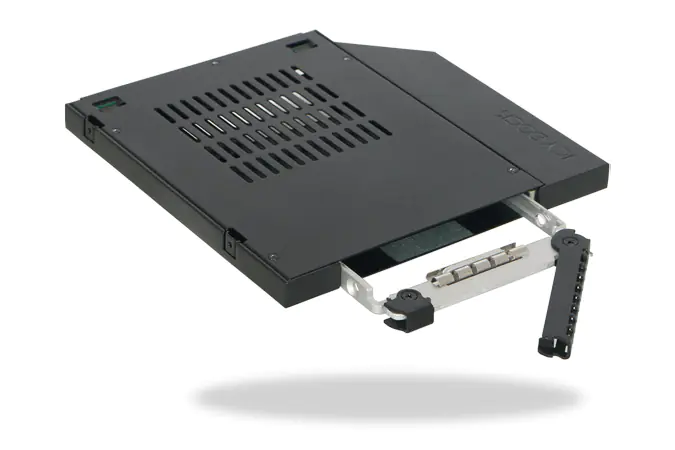 Mit dem ToughArmor MB411SPO-2B stellt ICY Dock einen komplett aus Metall gefertigten, 2,5" SATA/SAS Festplatten-/SSD-Wechselrahmen für den 9,5 mm hohen optischen Ultra Slimline Laufwerksschacht (Ultra-Slim ODD-Schacht) vor. Dieser findet sich hauptsächlich in neueren Laptops, Desktop-PCs und Workstations. Der MB411SPO-2B wird komplett aus Metall hergestellt und stellt somit eine maximale Lebensdauer sicher und widersteht selbst den widrigsten Umgebungsbedingungen. Der EZ Slide Slim Tray unterstützt 2,5" SATA Festplatten und SSDs jeder Kapazität mit Bauhöhen von 5 bis 7 mm und ermöglicht schnelle Wechsel via Hot Swap für eine einfache Wartung. Darüber hinaus unterstützt der MB411SPO-2B Übertragungsraten von bis zu 6 GBit/s während der interne SATA-Anschluss bis zu 10.000 Laufwerkswechsel erlaubt.
