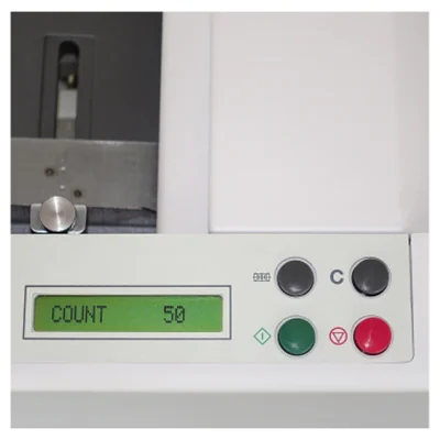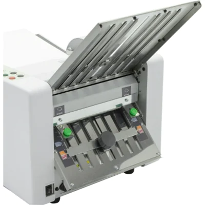 Kompakte Büro-Falzmaschine mit vier Falzarten und Bandauslage. Ausklappbarer Zuführtisch für 150 Blatt Papier. Falzgeschwindigkeit. Einfache Einstellung der Falzarten über Symbole und Farbcodes. Abschaltautomatik mit Displayanzeige beim Aufklappen von Gehäuseteilen. Automatische-Endabschaltung. Einfache Bedienung über Start-/Stoppschalter. Display mit Fehleranzeigen. Zähler für Addition (Totalzähler) oder Subtraktion (Vorwahlzähler). Bandauslage mit verstellbarer Papierauswurfrolle zur kontrollierten Ablage des gefalzten Papiers.