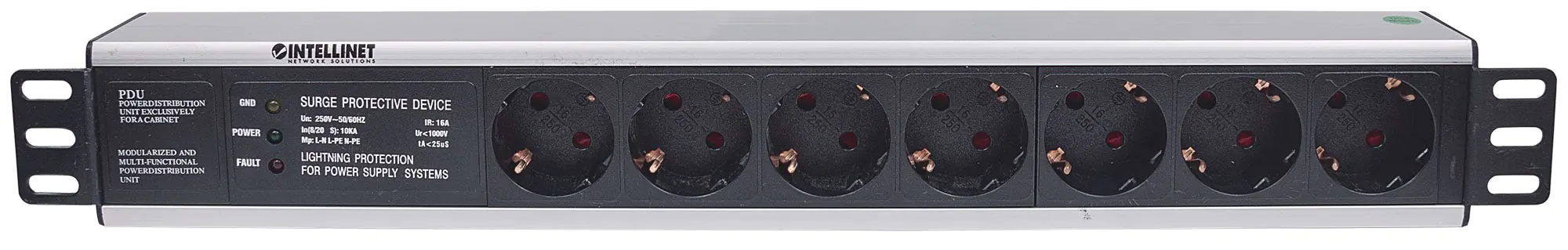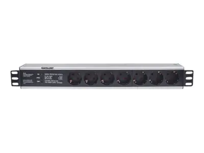 Intellinet 19" 7-fach Steckdosenleiste, Schutzkontakt, Überspannungsschutz, 3 m Stromkabel, 1,5 HE - Steckdosenleiste (Rack - einbaufähig) - Wechselstrom 250 V - Eingabe, Eingang CEE 7/4 - Ausgangsanschlüsse: 7 (CEE 7/3) - 1.5U - 48.3 cm (19") - 3 m - Deu