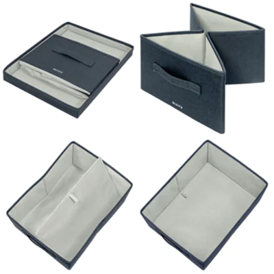 Faltbare Aufbewahrungsbox mit Deckel für die organisierte Aufbewahrung von Gegenständen zu Hause und im Büro. Schnelle und einfache Montage durch einfaches Auffalten der Box (ohne Kleber). Vollständig zusammenklappbar, um bei Nichtgebrauch Platz zu sparen. Der abnehmbare Deckel hält den Inhalt sicher und vertraulich. Griffe an jeder Seite erleichtern das Tragen und Herausnehmen der Box aus Regalen. Weiches Material zum Schutz des Inhalts verstärkt mit hochwertigem Karton für Stabilität und Haltbarkeit. Die Aufbewahrungsbox ist vollständig zerlegbar und zu 71 % recycelbar. Plastikfreie Verpackung. Die Stoffaufbewahrungsserie von Leitz vereint Wohnkomfort mit Premium-Qualität und schafft so eine positive und produktive Arbeitsumgebung.