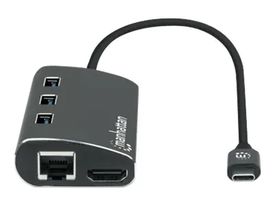 Manhattan USB-C Dock/Hub with Card Reader, Ports (x6): Ethernet, HDMI, USB-A (x3) and USB-C, With Power Delivery (100W) to USB-C Port (Note additional USB-C wall charger and USB-C cable needed), Aluminium, Black, 3 Year Warranty - Dockingstation - USB-C 3