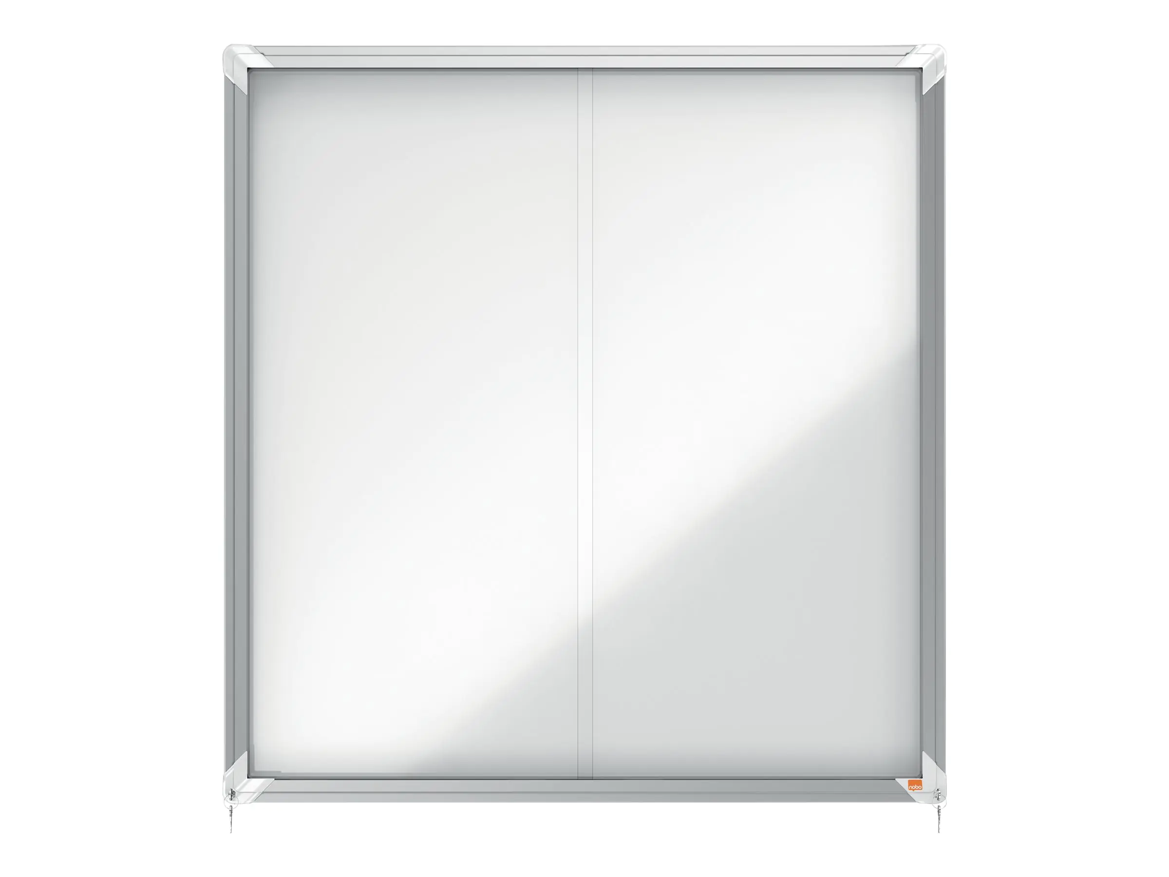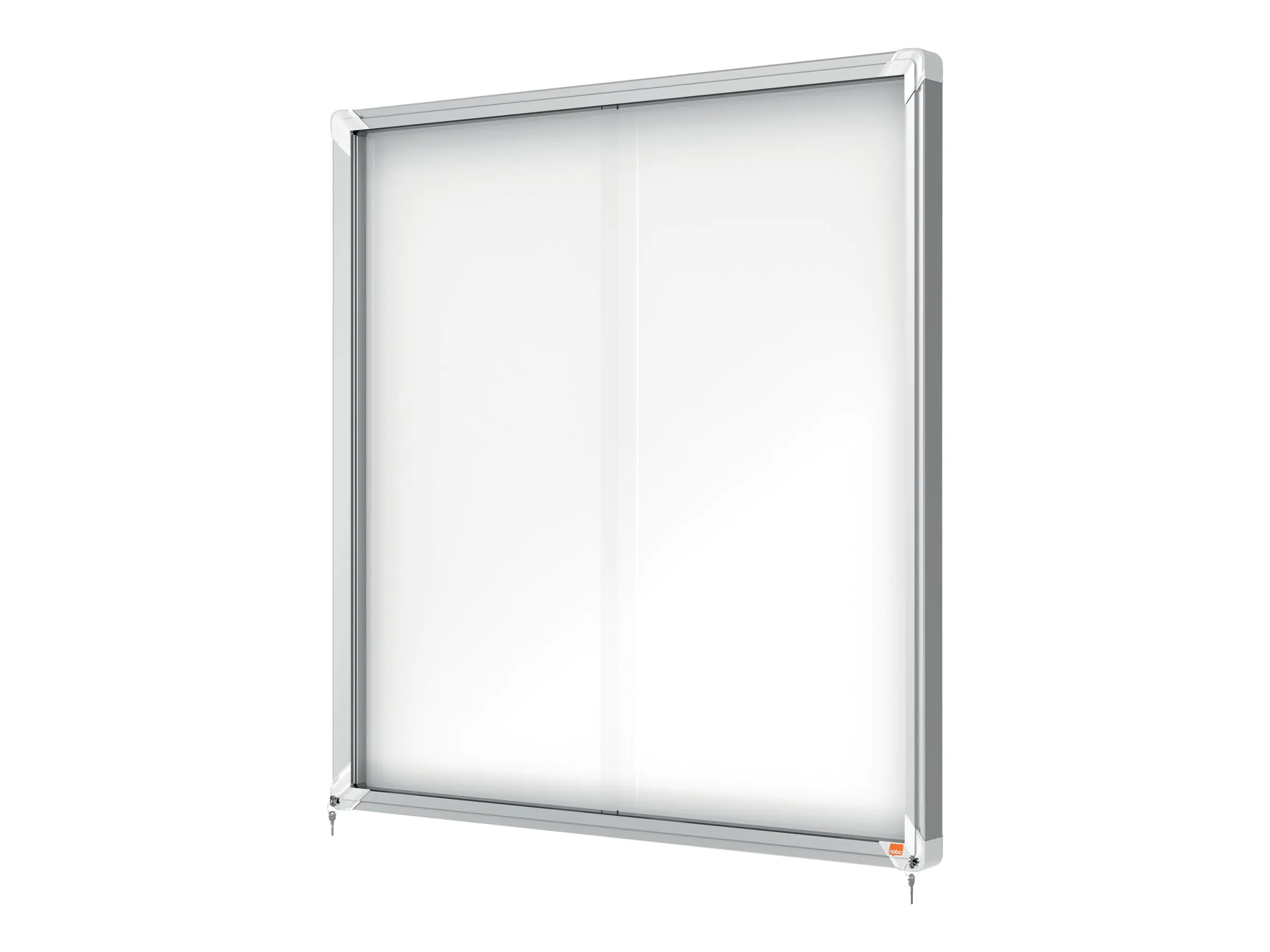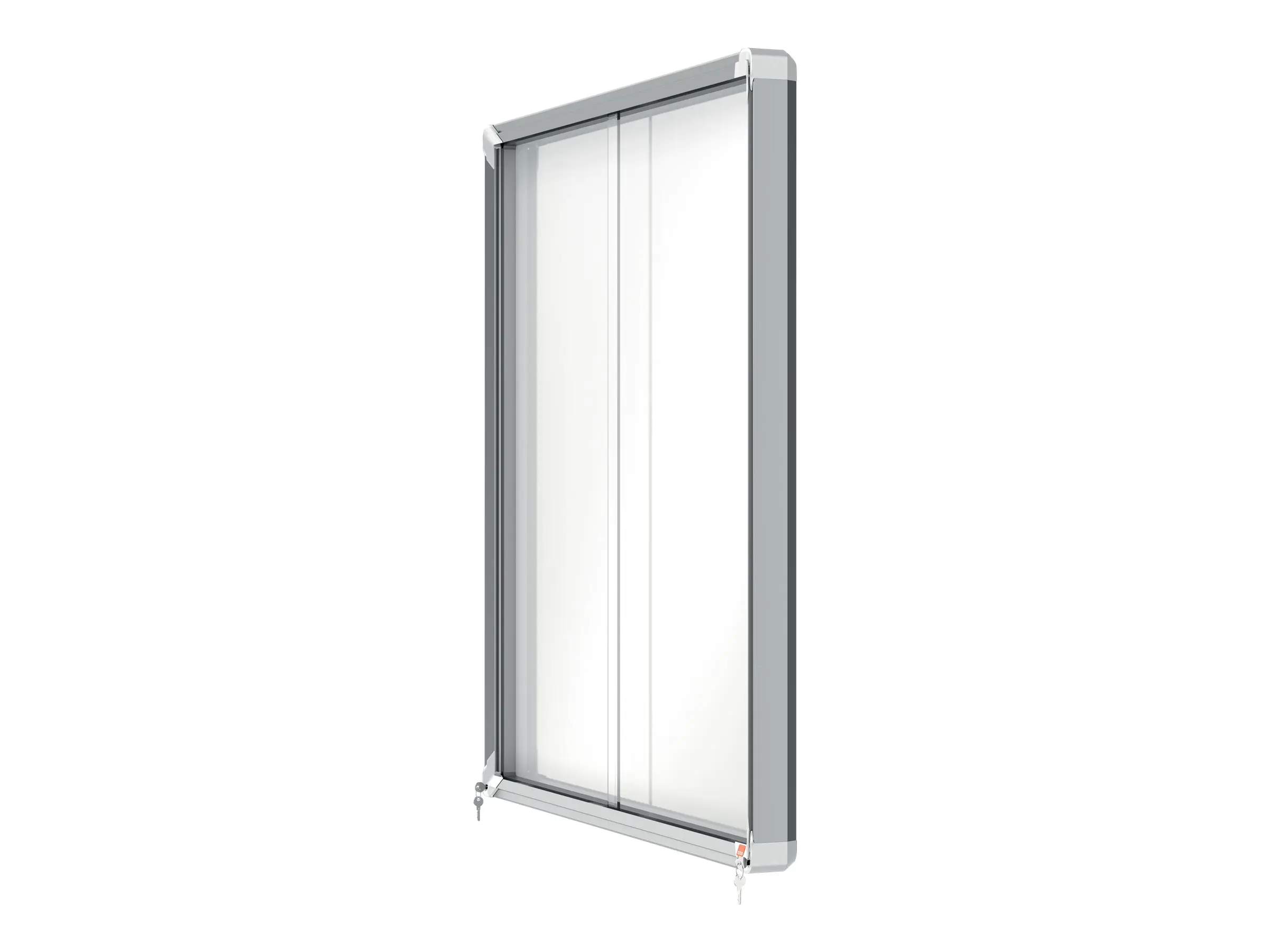 - Abschließbarer Schaukasten für den Innenbereich mit weißer, magnetischer, trocken abwischbarer Oberfläche, Schiebetür aus 4-mm-Sicherheitsglas und Sicherheitsschloss