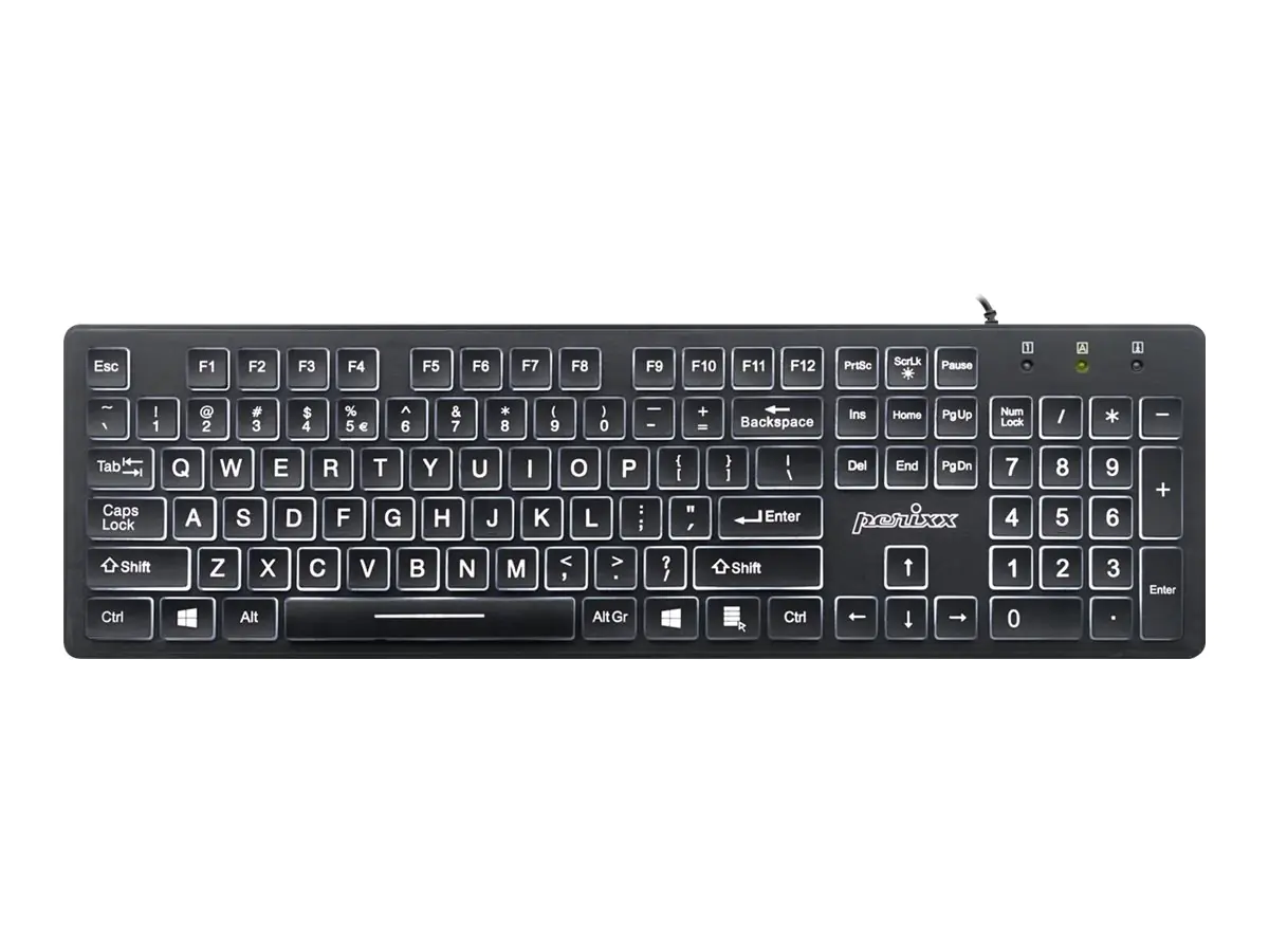 Perixx PERIBOARD-317 - Tastatur - Standard, mit großen Druckbuchstaben - hintergrundbeleuchtet - USB - QWERTY - USA - Schwarz