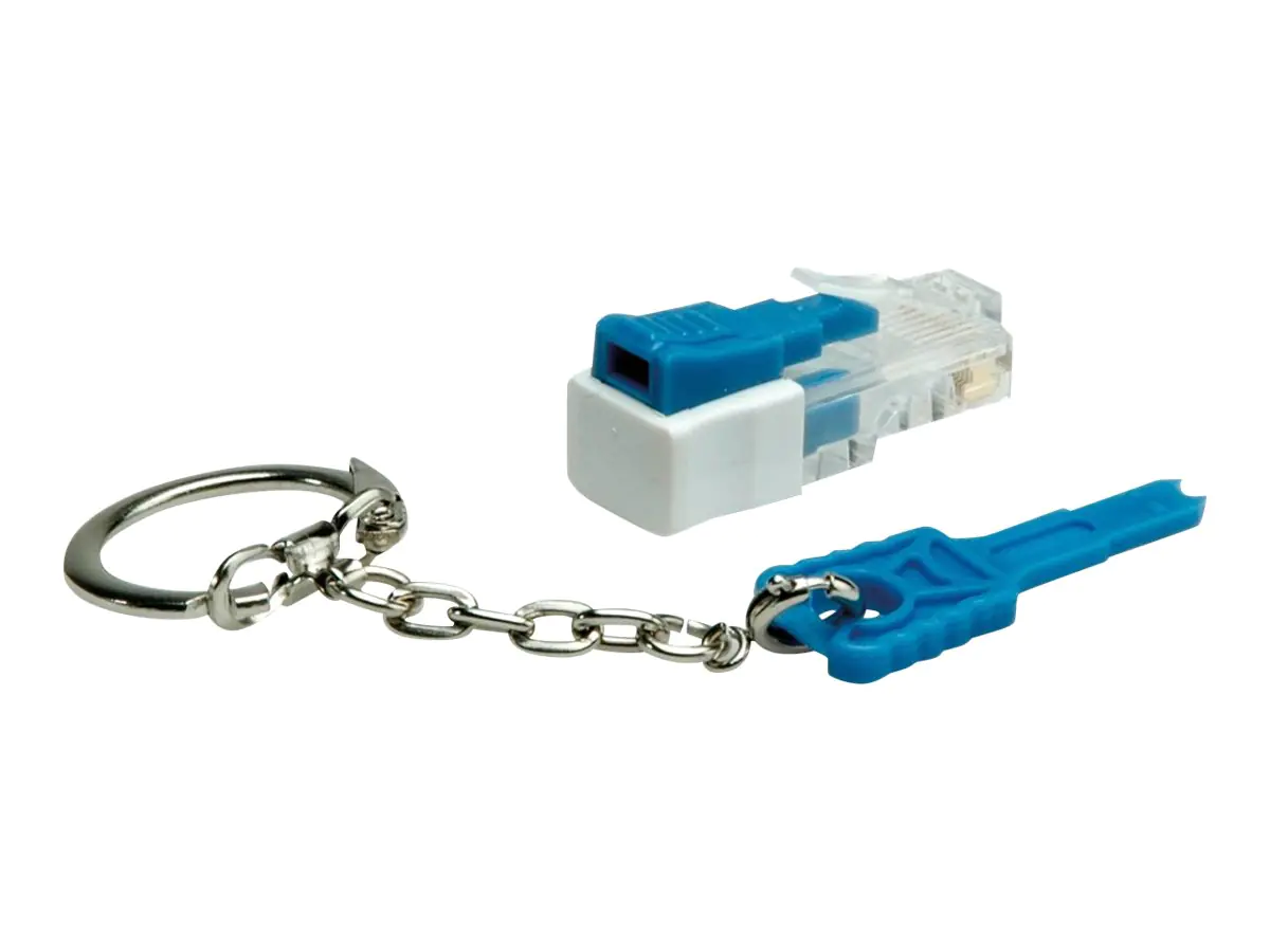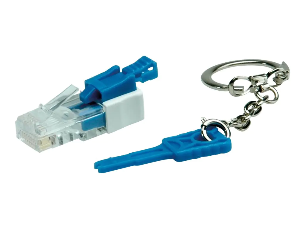 - Klemmt fest in jeder Standard RJ-45 Buchse; kann nicht mehr gelöst werden, wenn der Schlüssel abgezogen ist