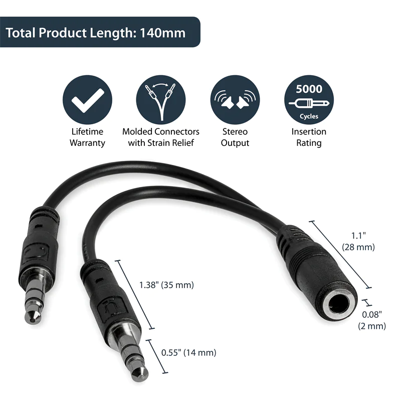 | Produktbeschreibung | StarTech.com 3,5mm Audio Klinke Y Kabel - Headset Splitter - Adapter - 1 x 3,5mm 4 Position Buchse 2 x 3,5mm 3 Position Stecker - Schwarz - Headset-Splitter | |||