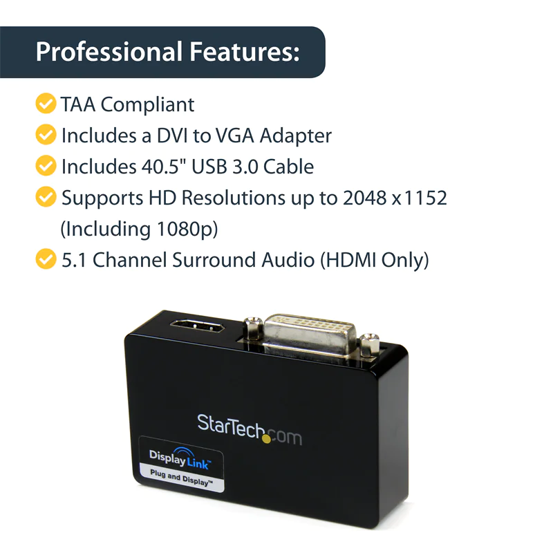 | Produktbeschreibung | StarTech.com USB 3.0 auf HDMI / DVI Video Adapter - Externe Dual Multi Monitor Grafikkarte - 1920x1200 - Videoadapter - HDMI / USB - TAA-konform | |||
