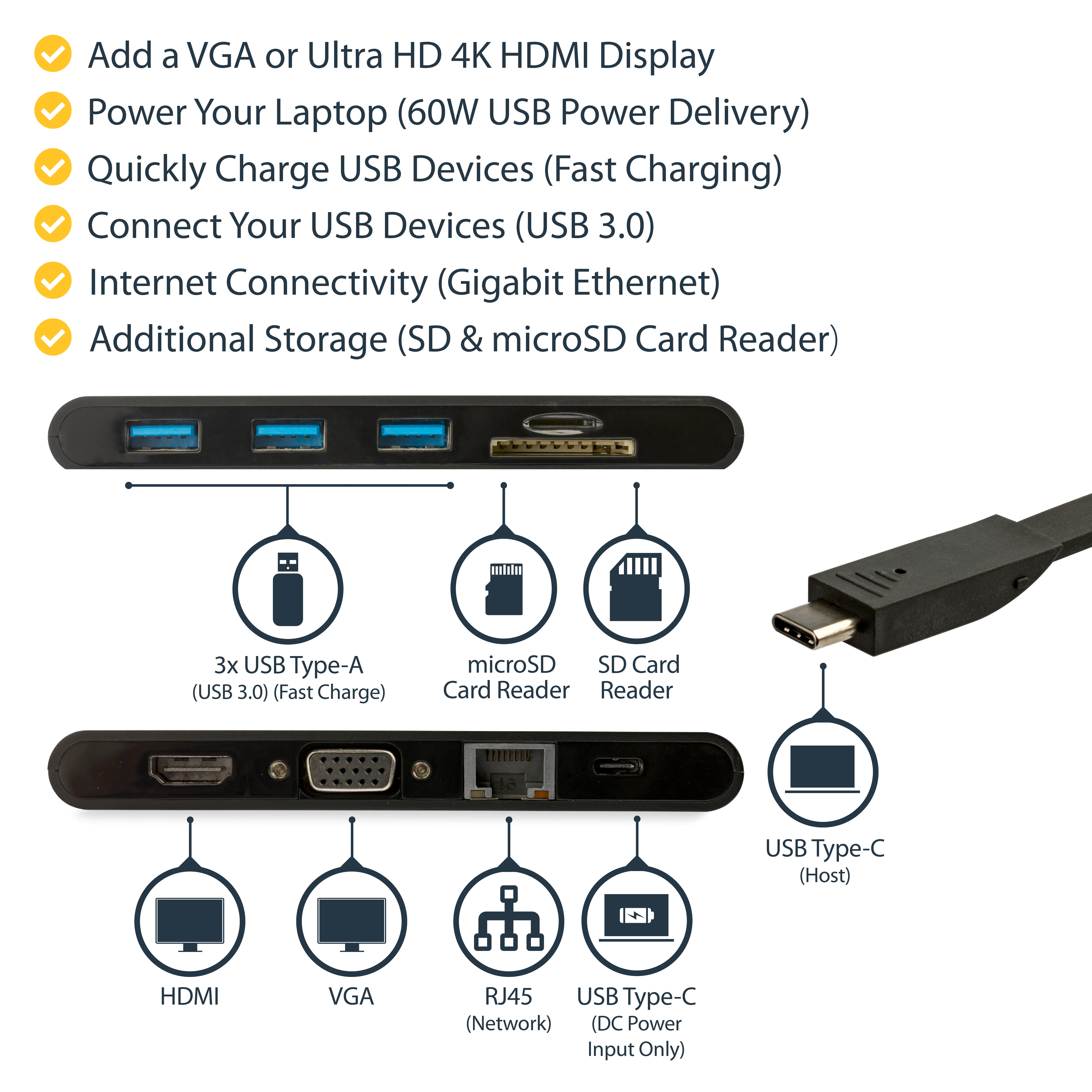 StarTech USB C Multiport Adapter, USB Type-C Mini Dock with HDMI 4K or 1080p VGA Video, 100W PD Passthrough, 3x USB 3.0, Gigabit Ethernet, SD & MicroSD Card Reader, USB 3.0 Adapter - USB C HDMI Travel Dock (DKT30CHVSCPD) - Dockingstation - USB-C - HDMI, V