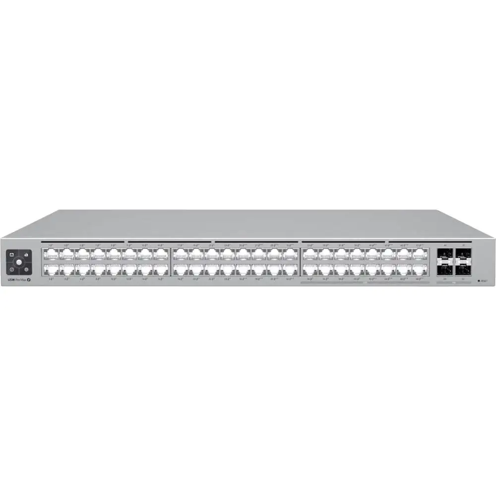 Der Ubiquiti UniFi Pro Max 48 PoE-Switch wurde entwickelt, um die Anforderungen moderner Netzwerke zu erfüllen, und bietet eine umfassende Lösung für die Stromversorgung und Konnektivität. Mit 48 Ports, darunter 24 PoE+-, 8 PoE++- und 4 10-Gigabit-SFP+-Ports, bietet er flexible Optionen für den Anschluss einer breiten Palette von Geräten. Das 720-W-PoE-Budget des Switches und das interne 820-W-Netzteil sorgen dafür, dass stromhungrige Geräte im gesamten Netzwerk angemessen unterstützt werden.