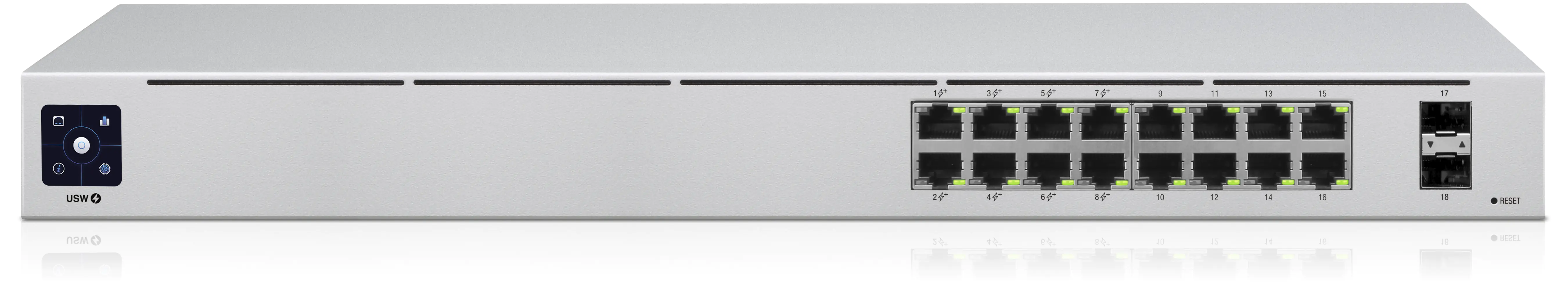 | Ports: | 16x 10/100/1000 (8 PoE+) + 2x Gigabit SFP | |