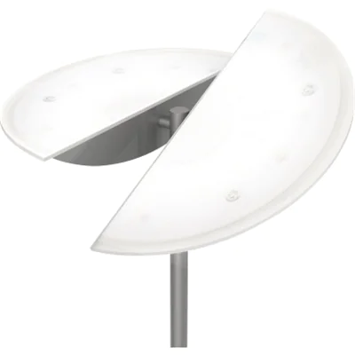 Dank eines Systems aus Kugelgelenken lassen sich die getrennten Hälften des Leuchtenschirms unabhängig voneinander ausrichten, um den Lichtstrahl entsprechend dem Bedarf des Benutzers auszurichten. Jede Hälfte kann vollständig nach oben gedreht werden, um eine indirekte Beleuchtung zu erhalten, die von vielen Ergonomen für Büroarbeitsplätze empfohlen wird. ZELUX ist mit von UNILUX entwickelten LED-Modulen ausgestattet, die eine starke Beleuchtung bieten. Damit ist ZELUX einer der leistungsfähigsten Deckenfluter auf dem Markt. Die Lichtstärke ist über einen Drehschalter am Gestell dimmbar. Die geteilte Lichtschale und die Milchglasabdeckung über den LED-Modulen gibt ZELUX eine ungewöhnliche und zugleich elegante Optik. Dieses Produkt enthält eine Lichtquelle der Energieeffizienzklasse C und kann nicht ausgetauscht werden.