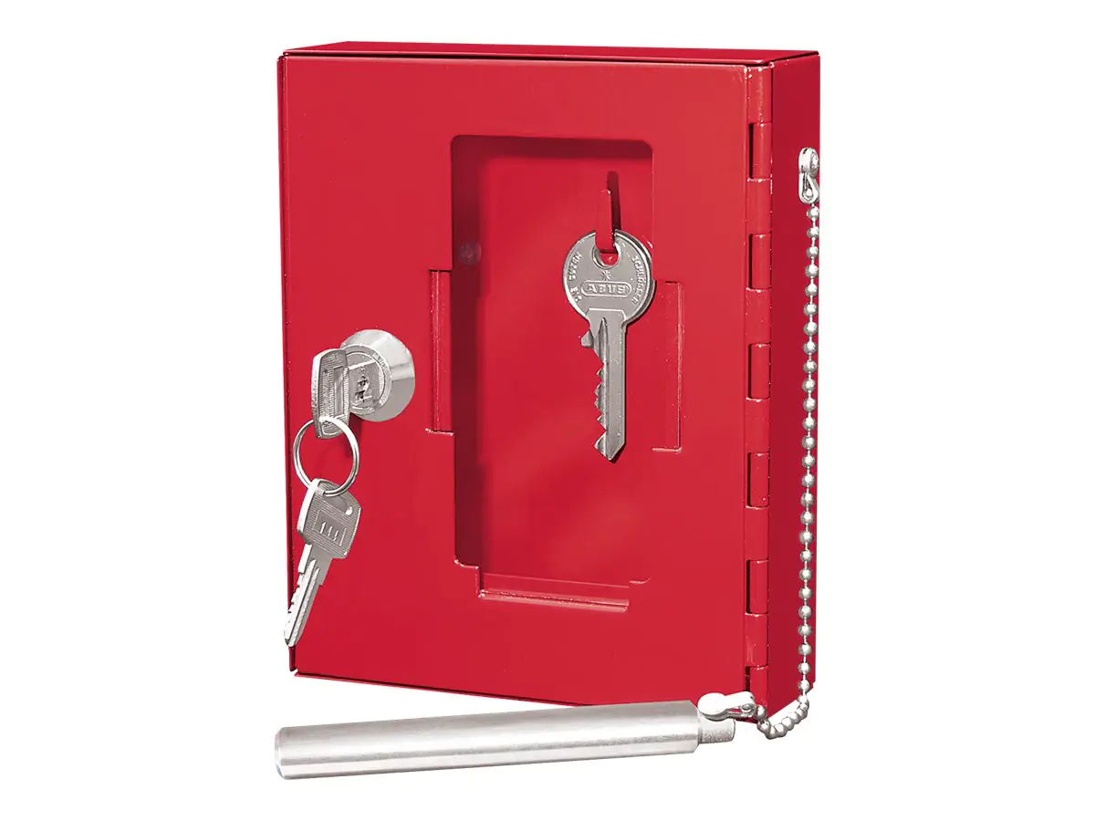 Notschlüsselkasten ausgestattet mit einem Schlüsselhaken für den Notschlüssel, der durch das Türfenster sichtbar ist. Der Klöppel zum Einschlagen der Scheibe ist an einer Kette befestigt. Die Glasscheibe ist auswechselbar. Zum Sicherheits-Schloss werden zwei nummerierte Schlüssel geliefert. Mit diesem Notschlüsselkasten können Notschlüssel sicher aufbewahrt und vor unbefugter Benutzung geschützt werden. Trotzdem ist der Schlüssel immer griffbereit, wenn er gebraucht wird. (Nach EN 179 nicht für Notausgänge einsetzbar).